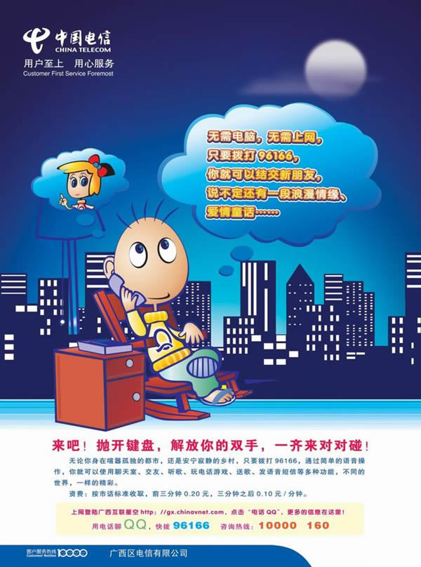 当前位置:中国广告人网站>创意策划>创意文案>详细内容 广西电信96166电话QQ宣传单页文案 作者:贝学益 时间:2006-2-27 字体:[大] [中] [小]