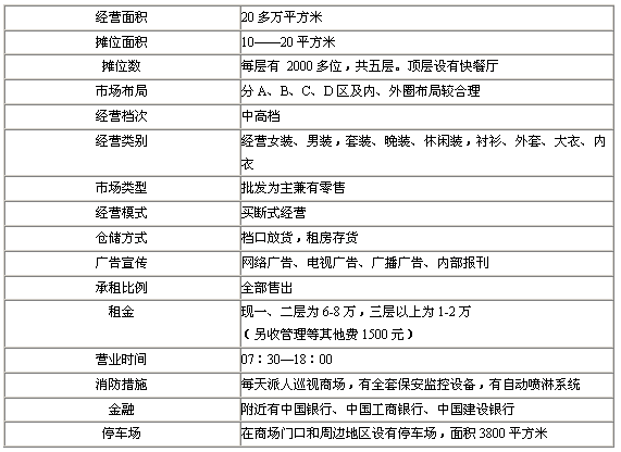 8.摊位面积大。在时装城内摊位面积从8—30平方米都有,但主要是18—30平方米的为主,明显要比其它市场摊位面积大;