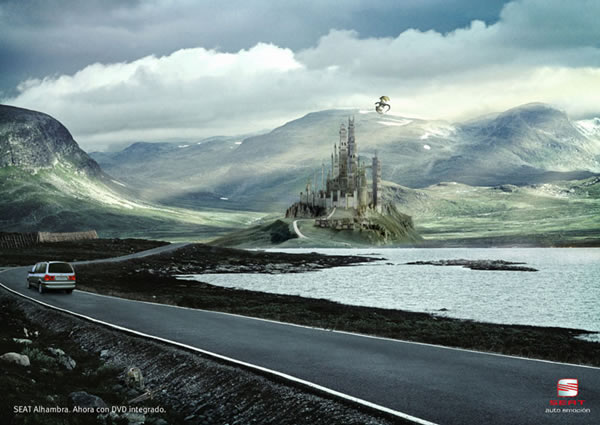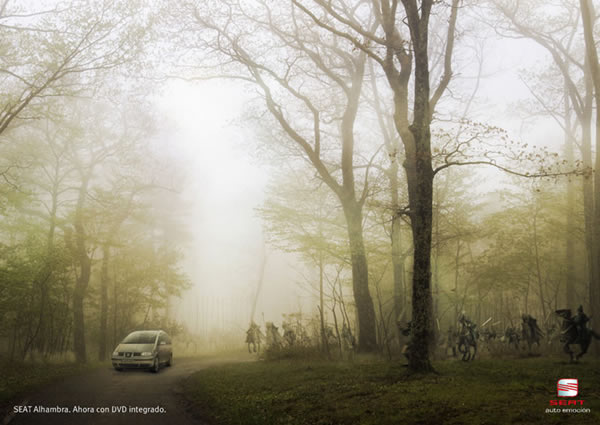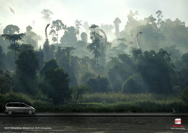 其实这个广告只是在告诉别人,现在买这种汽车可以帮你在汽车里安装DVD。所以设计师用了侏罗纪公园和指环王里面的壮观场景,既很好的说明这个活动的主题又可以突出这款汽车的越野性能!真是两全其美啊!