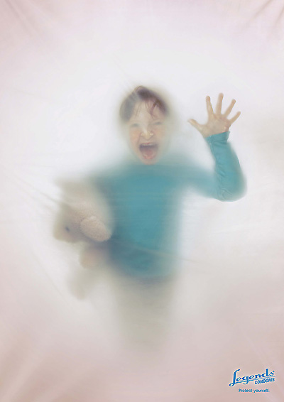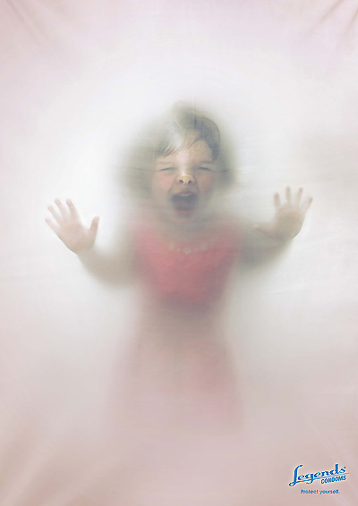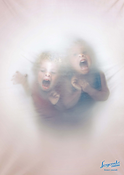 如果你怕小孩吵你,那就得注意安全。这个创意的主人似乎非常讨厌小孩的吵闹,将他们化为张牙舞爪的样子向自己扑来,幸好有一层橡胶膜将他们挡住了。而这层橡胶膜就是这个广告中的产品——Legends避孕套... ...