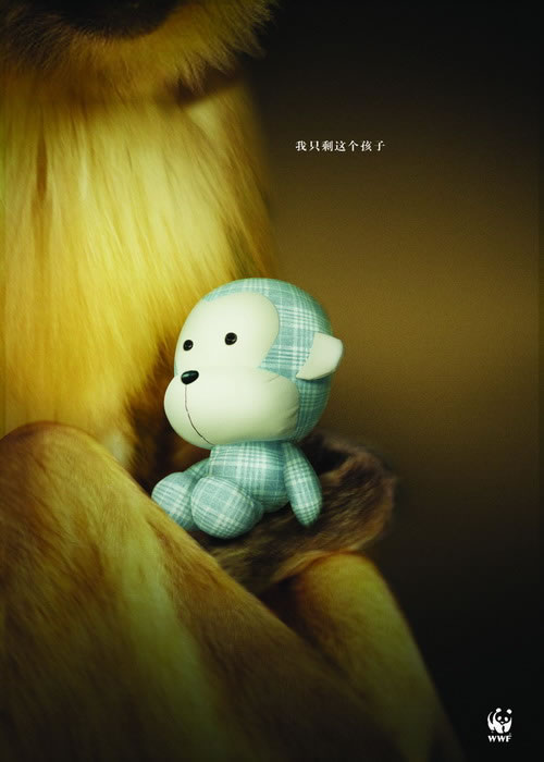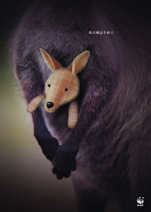 创意说明:一组反对捕杀野生动物的公益广告。这一类的作品常用的套路有两种,一是使用血腥的场面,引发人物对动物捕杀者的反感;二是使用可爱形象,引发同情怜惜的心理。应该说这组作品巧妙地取到了一个折中,可爱的布娃娃形象背后是无比深沉而令人心痛的动物妈妈角色。“移情”的修辞手段在这里得到了很好的运用。