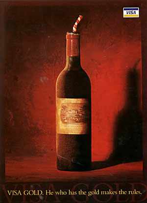 VISA GOLD.He who has the gold makes the rules.VISA金卡:谁持有金卡,谁制定规则。画面要表达的意思是:葡萄酒也可以用吸管来喝,因为喝酒的规则由金卡的持有者制定,他想怎么喝就怎么喝。