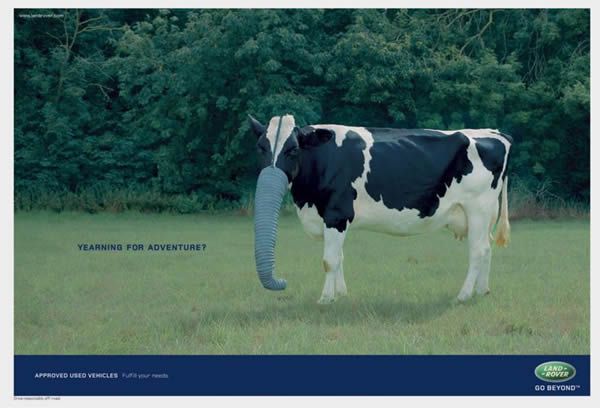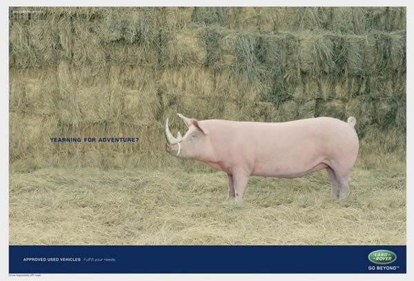 创意乱讲:家猪也想要体验犀牛的威风,奶牛也渴望像大象一样拉风。渴望去冒险,就驾驶Land Rover吧。这组作品挺奇怪的,车子的平面一般都会有车子做主角。间接或直接的,总是车子在导演一切。而这组作品,则是用比喻的手段来表达产品的诉求。确实很有趣,但是否会有效,待各位大方之家各抒己见。