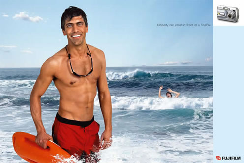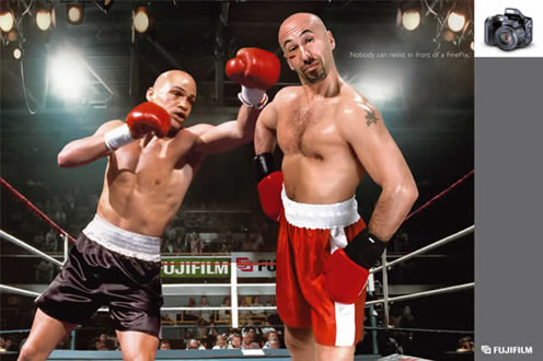 Nobody can resist in front of Finepix。没有人能拒绝这样的诱惑。想必记者朋友们对这组广告会比较感同身受,平时出去跑采访做报道,端着拉风一点的相机,顿时显得很专业(其实很可能是个摄影菜鸟),对象给我的表情都要生动些。夸张的情景制造出时分幽默的效果,画面执行干净紧凑,细节处亦毫不含糊(请注意拳击场背景广告牌的处理)。
