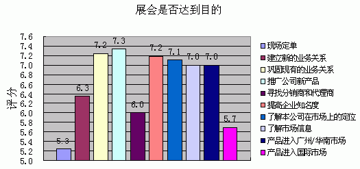 通过调查数据显示,参展商对本次展会达到公司预期目的总体评分为6.62分,基本满意。其中巩固业务关系、推广公司新品、提高企业知名度、了解市场定位、了解市场信息、产品在华南地区的推广等方面都比较满意;现场定单与产品获得国际市场方面不够理想。