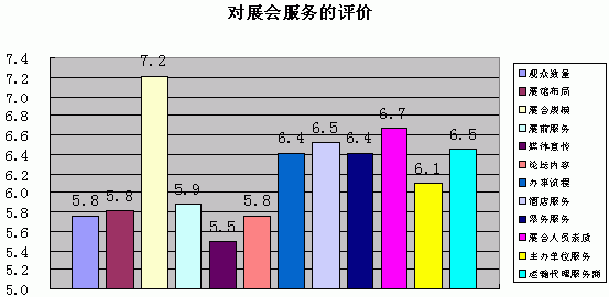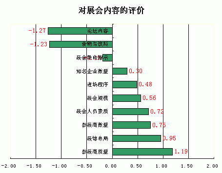 从观众对展会评价结果图可以看出,论坛的内容、食品与饮料、展会指示标示等方面明显不满意,对参展商质量的评价得分最高,观众对来参展的行业内知名厂家的数量期望值很高。对论坛内容的不满主要是由于他们基本上都没有参与论坛,对论坛内容不了解。每次展会都会准备有很好的专题演讲,但很多观众由于忙于参观产品、洽谈业务而忽略了参与论坛,其实也是一个损失,同时建议主办方要加强宣传,让更多的行业内人士可以了解到行业最新信息。增长知识,提高竞争力。