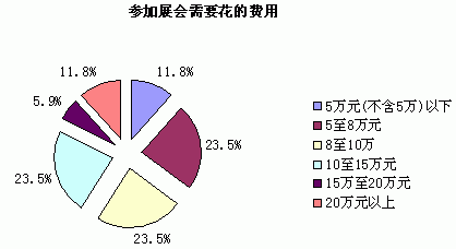 参加一次大型展会,参展商需要投入的总体资金幅度是:5万元以下的占11.8%,5-8万元的占23.5%,8-10万元的占23.5%,10-15万元的占23.5%,15-20万元的占5.9%,20万元以上的占11.8%。