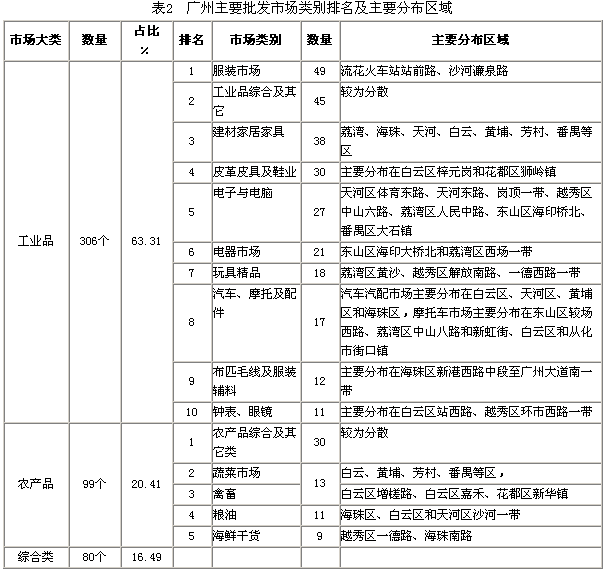 广州作为中国最早对外开放的区域,商业发展非常成熟,批发市场主要是在传统的农贸市场、集贸市场的基础上自发形成起来,并在此基础上不断升级改造发展起来。几乎包括了所有行业。根据政府数据,广州共有大中小型各类专业批发市场485个(有一种说法是超过1000家,这并没有具体的统计数据,不太确定)。按行业划分为工业品批发市场(包括生产资料和生活资料)、农产品批发市场(包括生产资料和生活资料)和综合类批发市场(既经营工业品又经营农产品)。