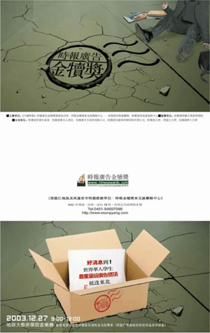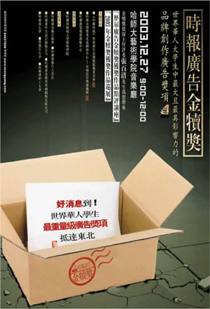 主画面内没有繁杂的文字诠释活动的意义、活动的内容,只有一句对活陈述清晰准确的定位:“世界华人学生最重量级的广告奖项抵达东北”,毫无遮掩地“暴露”在您的眼前;还有一个竟可以震撼大地的“邮箱”,其实它也没什么特别嘛!仅仅是因为在一侧烙上了“时报”的大印而已。