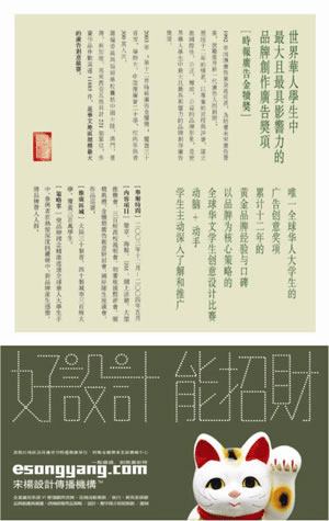 文案在细节运用上完全采用古典风格的版式排列,大小错落的字体、小色块的点缀,当然更出彩的还是那个“时报广告金犊奖”的金色大印,其渐变色彩的调配与画面风格结合得恰倒好处。