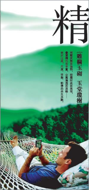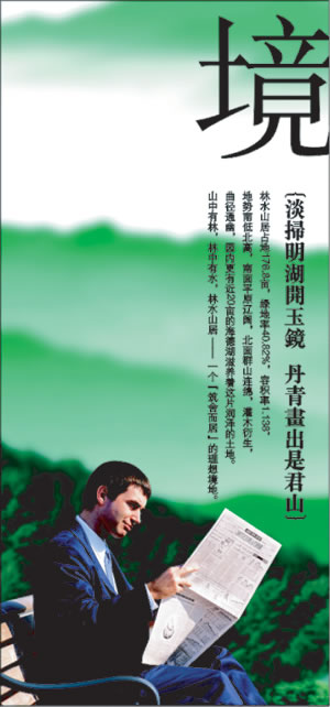 在项目的平面设计风格表现中,设计师将主色调定为代表自然界的绿色和代表时尚现代生活的橙色两种色调,大块鲜明跳跃的橙色块穿插于充溢眼底的清新绿色之中,既蕴涵着项目“聆天籁之音、闻学院书香”的清新自然感,又将目标客户群对于时尚事物的追寻和认同融入其中,设计表现风格打破了许多传统楼盘表现风格单一的局限性,橙绿对比的鲜明色彩很容易吸引受众的眼球。特别是对项目核心概念的平面表现,设计师在尊重项目原有的建筑设计效果图的基础上,选取了一些意境优雅的山水风景图案,以及与目标消费者的身份相符的“悠然生活状态”的形象代言,作为主要的诉求方式,营造出一种令人向往的全新居家生活意境,清新的格调与时尚的形式互为交融,产生了具有连贯性的表现传达效果。