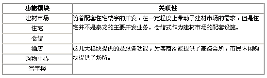 泰龙现代商城包括多种物业形态:建材交易市场、四星级酒店、商业(包括购物中心和写字楼)、配套住宅、配套仓储等,但是泰龙现代商城的投资重点是在长期运营的建材交易市场、酒店和商业物业。住宅和仓储是作为建材交易市场的配套内容。下表将分析泰龙现代商城功能模块的产业关联度,从而考察几个模块是否能够实现优势互补。