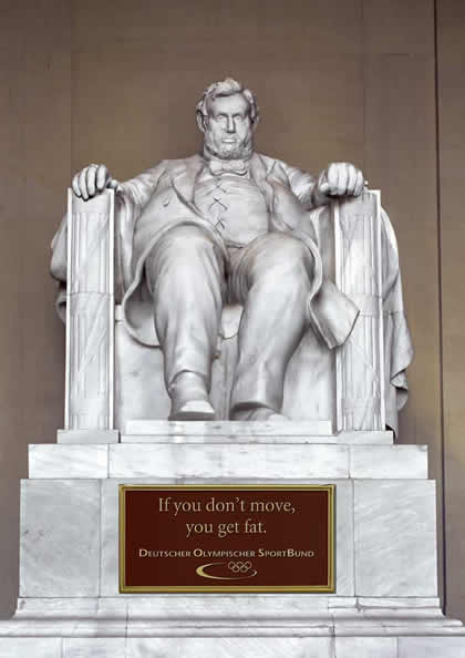 德国奥林匹克体育联合会(German Olympic Sport Federation),为鼓励人们多做体育锻炼而做的宣传。雕塑底座的文字是:“If you don't move, you get fat.”(如果不活动活动,身材发胖就会伴随你)。