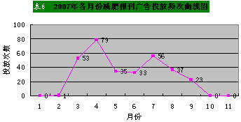 两个减肥产品选择了在2月底开始投放广告外,大部分产品是从天气开始转暖的3月中上旬开始投放,并且投放力度比较大,当月全部广告投放频次加起来有53次,投放金额超过190万元。到了4月,监测地区的减肥报刊广告的投放次数达到全年的最高峰,投放品种11个,所有减肥产品的报刊广告投放频次加起来有79次,总投放金额达到260余万元。这说明4月份是减肥产品的黄金季节,大部分减肥生产企业把营销重点放在了这个天气即将转热、消费需求旺盛的月份,因此,这个时期的市场竞争也最为激烈。但到了5、6两个月份,整个减肥市场的报刊广告投放不但没有随温度的上升呈现上扬趋势,反而表现出了大幅缩水,这个时期的减肥产品品种由前期的11个锐减到6个,所有减肥产品在这两个月的报刊投放次数加起来不足70次,还不如4月份一个月的投放次数;到了7月份,参与竞争的减肥产品只剩下LPA、夜夜瘦减肥贴、9快9、禁果、果茶抽油瘦5个减肥产品,这个时期LPA依然在承担了80%的报刊广告投放力度,但整个减肥市场并没有因为LPA的力挺出现牛市,大多数产品开始鸣锣收金,报刊广告从此开始一路下滑,到2007年10月,已经很少见到减肥广告出现,整个减肥市场表现出一片孤寂的态势。(见表6)