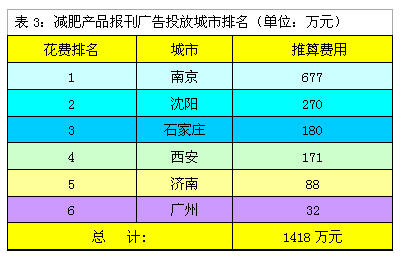 万方&红火广告策划人才机构行业数据中心监测显示,截止2007年10月,我国省会城市报刊广告总体规模已达9000余万元,加上二级城市的报刊、杂志广告投入以及电视媒体的投入,整呈上升趋势。万方&红火广告策划人才机构重点选择了华北、华东、华南、西北和东北5个地区的省会城市石家庄、济南、南京、广州、西安、沈阳等六大城市作为重点监测区域,并以当地主流报刊作为监测媒体,对2007年的中国减肥产品的广告投放情况进行了监控分析。以此,对2007中国减肥市场做一梳理及分析。