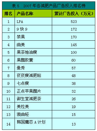 从各减肥产品的广告费用排名情况看,2007年在监测地区的各类减肥产品报刊广告总投放为1418万元,其中居于冠军地位的是,在2~10月份的监测期内共投放523万元报刊的广告费,为减肥产品整体投放费用的38%;其次是9快9、禁果、果茶抽油瘦,这三类产品在2007年的报刊广告费用均在100~170万元之间,与冠军LPA相比,属于中度投放;果醋胶囊、曼秀、夜夜瘦减肥贴、七点瘦、正点苹果醋片、御生堂减肥茶、美拉美、澳曲轻、韩国魔恋A计划等减肥产品的报刊广告投放均属于比较底的品种,9个品种的广告费用加起来刚好接近投放冠军LPA一半。(见表4、表5)