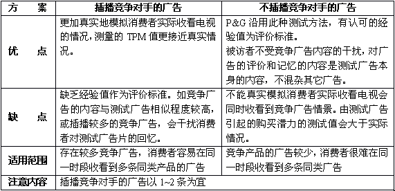 【评价】依据选择插播广告方式的不同而有所区别,在方案1里有竞争对手广告出现时,如果测试广告的TPM值大于对手,就可以考虑广告的播出;在方案2没有竞争对手广告的情况下,如果测试得出新产品的TPM值大于18%时就可以考虑播出。