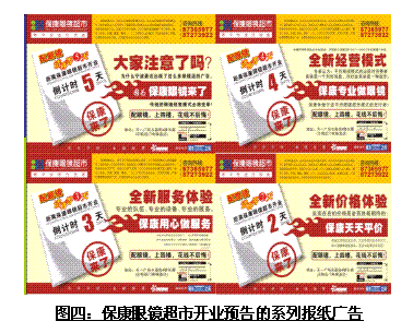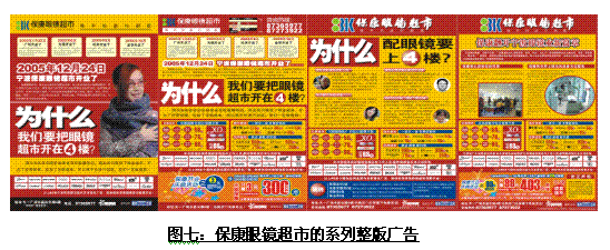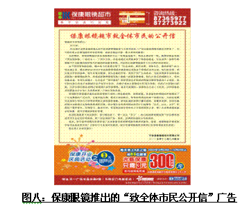 在保康开业之后推出的一系列广告宣传中,保康紧紧围绕“为什么我们要把眼镜超市开在4楼?”、“为什么配眼镜要上4楼?”等内容做足文章,把自己存在事实上的劣势比较诚恳地向消费者说明企业的本身意图,并甚至用“保康眼镜超市致全体市民公开信”的形式,一方面对消费者购物带来的不方便表示歉意,同时也帮消费者算清保康眼镜超市怎样能够做到“相同品牌、相同型号、相同服务”的前提下,价格能够更实惠、更优惠。同时巧妙地把近期宁波眼镜商店为什么不约而同开始大规模进行广告投入和促销活动的真正原因进行了说明,使得消费者知道为什么传统眼镜店对保康眼镜超市的到来会这么的紧张。并且把消费者很容易理解的“(因营业地点从1楼到四楼)租金成本的大幅降低、(因面积是普通眼镜店的数十倍)营业规模的数倍扩大、(因销售量的增大)进货价格的明显下降”等因素带来的直接利益传递给消费者,使消费者中较为理性的一部分人群很快能够说服自己“上四楼虽然有点不方便,但直接利益很明显”。从而通过“讲道理”赢得尝试性消费人群的青睐。