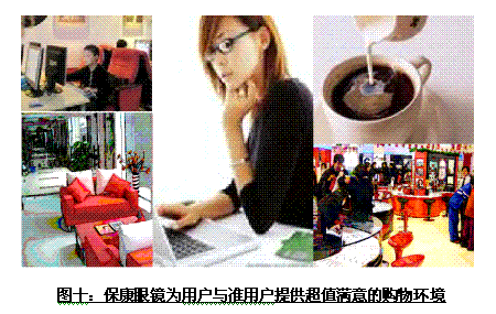 保康用近200平米设立了休闲区,一方面巧妙地将平价区与精品区进行了区位区隔,另一方面为打造自己保康独特的购物环境与增值服务提供了很大空间。由于传统眼镜店都是在寸土寸金的黄金口岸开设的,所以除了奢华的装修外,基本没有太多地考虑消费者在选购眼睛过程中需要较长时间呆在店里的事实。而保康超大的营业空间给了自己很大的想象空间,在休闲区内有书吧、网吧、茶吧、咖啡吧、电视吧等功能的设置,使得无论是配镜需要等待的消费者,还是陪同前往的亲友,都无需再焦虑中等待。而是可以在装修精致、十分舒适的环境中选择自己感兴趣的项目消磨等待的时光。而且提供的这些一切服务都是免费的,这对于本来就很满意的消费者又多了一份得意,于是事后向其他朋友介绍成为了保康眼镜最好的“口碑宣传”广告。