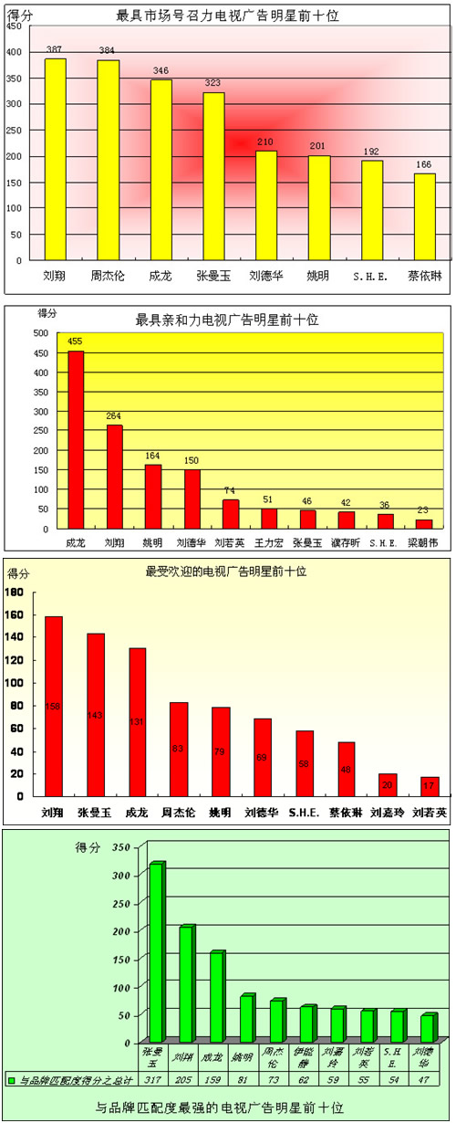 上海市民心目中的中国电视广告明星调查,主要是从受众、消费者的角度来进行测评,让上海市民评选出自己心目中最具亲和力电视广告明星;与代言产品品牌最匹配电视广告明星;最具市场号召力电视广告明星;最受欢迎电视广告明星等