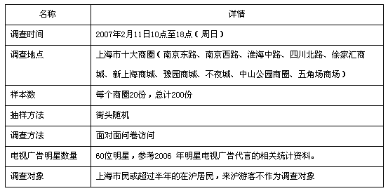本项目主要是从受众、消费者的角度来进行测评,通过在上海的十大商圈随机抽样选取200位不同年龄段的人群进行问卷调查,让上海市民评选出自己心目中最具亲和力电视广告明星;与代言产品品牌最匹配电视广告明星;最具市场号召力电视广告明星;最受欢迎电视广告明星。