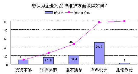 目前,房地产企业从观念上都认识到了品牌的重要性,但真正落实到行动上还有一个应从感性到理性、从自发到自觉的一个转变过程。从我们调研的结果(图二)看出,员工认为企业在品牌维护方面做的非常到位的仅仅占到3%,而46%的人持否定态度、认为还有距离和不清楚,而认为有些努力的占到50%。