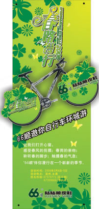 前期宣传:2006-66顺”春路漫行”自行车环城游活动结合当地媒体(报社,电视台,网站)和自行车车体,终端专卖店吊*POP,活动海报,橱窗共同进行宣传。根据各办事处分公司上报车数制作自行车车体,橱窗海报。