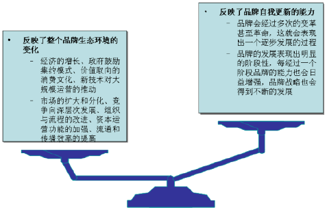 其次,品牌成长曲线(brand growth curve)也反映了品牌自我更新的能力,品牌生态环境的优化对于卷入其中的品牌而言既是机遇也是挑战,为了求生存谋发展品牌会经历多次的变革甚至革命,这就会表现出一个逐步发展的过程并表现出明显的阶段性,每经过一个阶段品牌的能力就会日益增强,品牌战略也会得到不断的发展,品牌就这样不停地挑战自己不停地跨越巅峰。