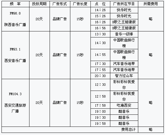 对此,我们选择了广告套播的方式,在所选频率中展开短期的、集中式的宣传,具体计划如下: