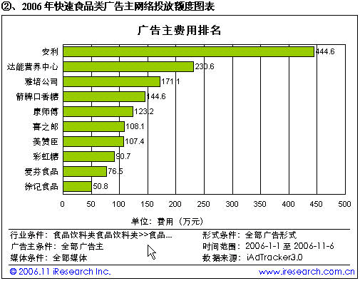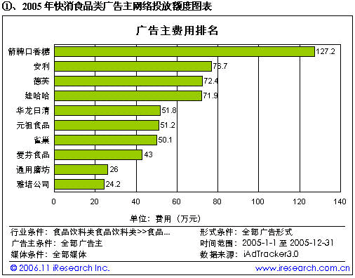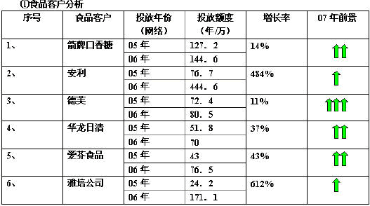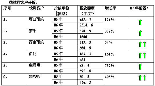 分析:以上表格主要表明,箭牌口香糖、德芙、华龙日清和爱芬食品在网络上的投放06年比05年都有大浮增长,特别是安利和雅培公司的增长额度成翻倍之势上升,超出平常的增长速度。说明当今快消行业正在借助网络的普及东风,持续扩大自己的网络预算,由此预估07年网络预算,将持续成上升趋势。