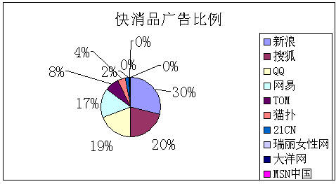从上图中可以看出:快消的投放频道比较清晰,几乎各网站首页均是首选,除了一般大流量的首页和新闻外,其余多集中在娱乐、女性、QQ等受众群年轻的媒体频道。