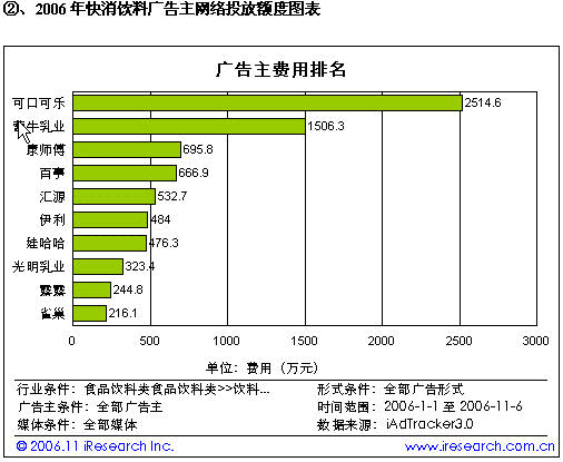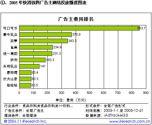 分析:以上图表说明,快消行业中的饮料更加适合网络营销,其增长额度远远超过同行业的食品,其中可口可乐由于国际品牌的深厚背景,加之对网络营销的深刻理解,已达到相当高的水平,由此可见百事可乐在网络蕴藏的强大的潜力,有待挖掘;国内的领头羊蒙牛仅次于可口可乐,但,像康师傅、娃哈哈、伊利等老牌快消饮料的升值空间同样不可忽视。