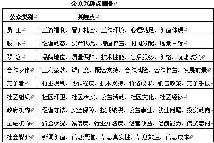 共性目标是针对公众共性特点制定的总体性目标,“树立良好公众形象”就属于共性目标;个性目标是针对公众个性设立的目标,比如:针对供应商、政府、金融机构开展专项公共关系活动制定的目标。