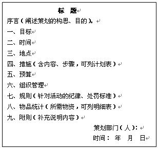 策划书的写作要求规范、主次清楚、题意明确。常规的策划书格式如下: