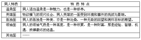 要突现品牌,那就要回到原始的起点去思考。何为男人?难道男人是钢铁铸就的吗?我们翻开历史的画页,看一看唐太宗、看一看康熙,再到今日看一看诸多的伟人与企业家,这些均是些有血有肉的男人,他们不仅仅要在自己的沙场中撕杀,还要在生活中扮演诸多角色。回到理性分析,我们可以看下表: