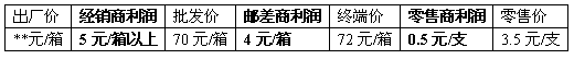 大的特点是它的价格体系很好地保证各个分销环节的高利润,提高各分销环节经营王老吉积极性,红罐王老吉给经销商的到岸价是**元/箱,(完成销售任务年底再返利*元/箱,经销商任务不算太高,省级经销商一般3000万元/年左右,区域经销商一般300万元/年左右,做得好半年就完成了,每年7月份广东加多宝饮料食品公司(王老吉生产厂家)各大区就开始规划明年的营销计划了),总经销给下线的邮差商批发价70元/箱(完成季度销售任务返利2元/箱,完不成返利1元/箱),邮差商供应终端价72元/箱,终端零售价3.50元/支。各流通环节价格体系与利润关系如下表(涉及商业机密,不提供某些数据):