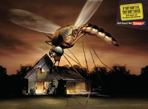 在广告中处理像苍蝇和蚊子这种小玩意儿真是很麻烦的事情,因为我们如果以正常的眼光来看,蚊子根本是小到很难被发现的家伙,呈现在作品中更是如此。所以我们经常看到的同类作品中,往往是在以嗡嗡声代表了蚊子的存在,即便有些特写,也往往难以跳出写实的窠臼。