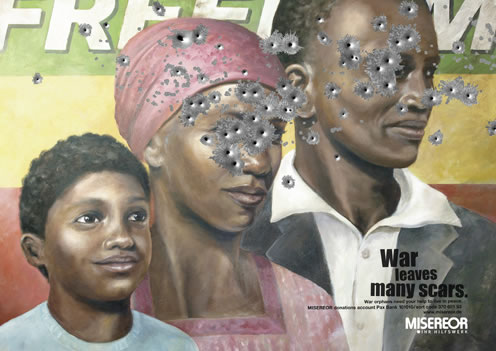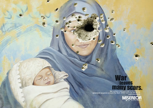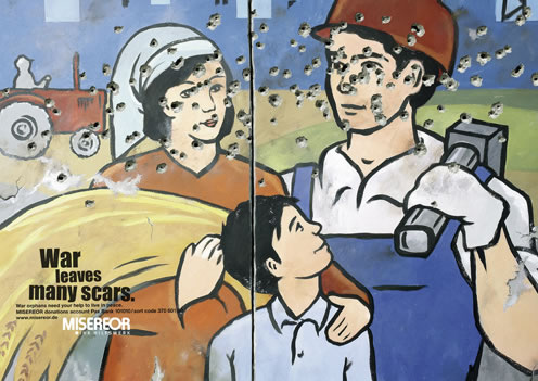 创意乱讲:这是一组呼吁援助战争孤儿的墙体户外,画面所讲述的分别是来自索马里、伊拉克和车臣的情景: