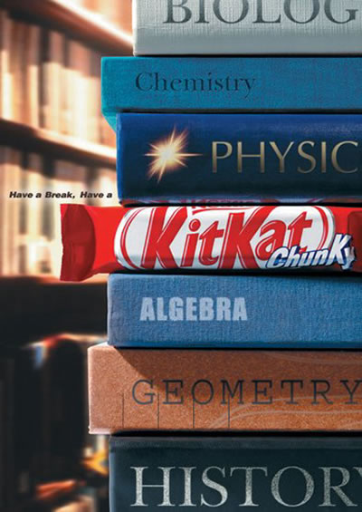 来一根kitkat chunky 威化饼。看到这堆书中间插着的kitkat chunky,和“Have a break, Have a kitkat chunky.”的字眼,也许你就明白广告的意思了。