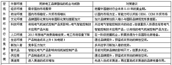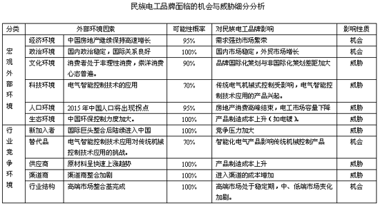 中国房地产经历过10年的高速发展,业内人士认为在2015年将是中国房地产的拐点,至少在未来的8年时间内国内建材市场将持续处于需求强劲的繁荣状态。而且中国经济的高速增长与国内政治环境的稳定,更为电工行业的发展创造了一个良好的外部机会平台。但是我们也要客观地看到电工产品国内消费者处于非理性消费,崇洋消费心态普遍,国际电工巨头的品牌国际化策划与民族电工品牌非国际化策划差距大;电气智能控制技术应用的产品兴起,传统电气机械式控制主导受影响;中国环保控制力度加大,产品制造成本上升(如电镀);等一系列的文化、科技、生态环境因素的变化对民族电工行业带来的威胁是重大的,预计2015年中国人口将出现拐点的人口环境变化,更是给民族电工行业的快速成长划定了一张期限时间表。