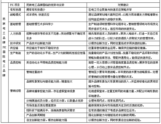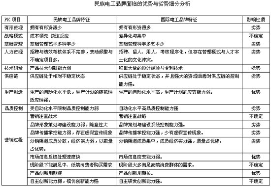 民族电工品牌与国际电工巨头相比,由于先天与后天环境的共同作用,在有形资源上面存在的巨大的劣势,同时在基础管理、人力资源、供应链、技术研发、生产制造、品质控制都与国际电工巨头存在一定的差距。在营销的过程中民族电工品牌宏观上注重战术的应用,而国际电工品牌更加注重战略的应用;民族电工品牌在品牌形象的策划与建设、传播控制、渠道管理、产品创新、资本运作等领域存在一定的劣势。而在市场信息反馈处理速度、生产计划的适应性和熟悉本土文化方面存在较大的优势。