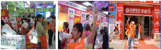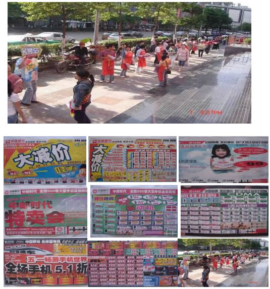 五一上午, 中华南路 和 喷水池 两个手机商圈,憋足的劲的手机连锁卖场和手机品牌厂家,几乎是倾巢出动,进行着一场军事演戏般的宣传造势。店外,一排排举牌队,打旗队,模特队、喊话队、传单派发队此起彼伏井井有条地演练着自己的绝活儿;店内,音乐声,喊话声,讨价还价声,手机铃声如雷贯耳,谁都听不到对方在说什么。买卖双方和风细雨的互答,变成了顾客趴促销员耳朵上问一句促销员再趴顾客耳朵上答一句的吆喝。卖场内到处是捡便宜的顾客,到处是临阵指挥的业务员,到处是声嘶力竭促销员,到处是挥汗如雨的临促,到处是虎视眈眈的保安。。。。。。