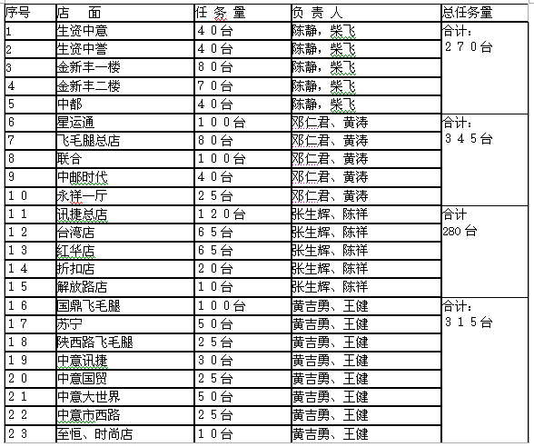 销量任务奖励措施:完成金立手机销售900台,奖办事处人民币1000元;完成任务1200台,奖办事处人民币2000元。业务员100%完成销量任务奖个人500元。业务员未完成60%的销售任务,给予处罚500元。(见下表)