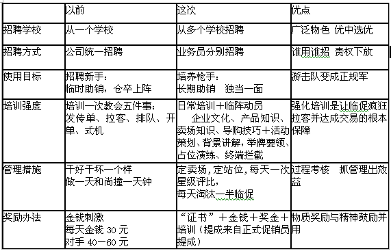 使用临时促销员助销,可谓养兵千日用兵一时。本做谁用人谁招人的原则,贵阳办对于招聘和培养临时促销员的方式作出了重大的调整。实践证明,此次促销,临时促销员召之即来,来则能战,与业务员对其加强管理是分不开的。