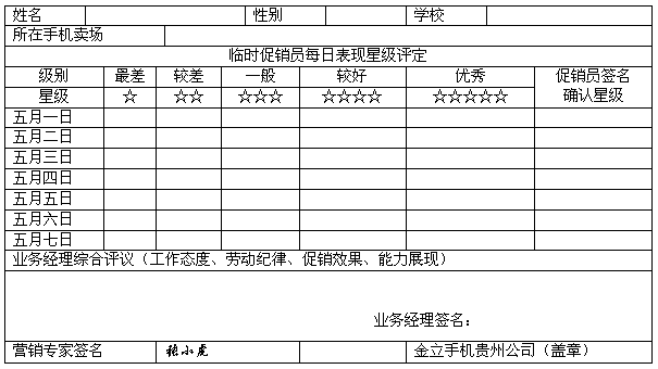 调查的知,大学生勤工俭学做促销不仅仅为了挣钱,他们也同样希望通过社会实践提高自身能力。相对于每天几十元报酬,他们更希望得到企业对他们的一纸评语为就业增加砝码。为此,笔者安排设计了以下这张《金立手机五一促销评议表》,让正式促销员和业务员每天按照“五个星级”评定临时促销员。对于获得三颗星以上的50%表现好的临促予以表扬,次日继续留用,对于获得二颗星以上的50%表现不好的临促,就地PK(炒鱿鱼),当日结清报酬。严格的考评,严明的纪律,保证了执行力度。五一那天,临促个个挥汗如雨,几个临促坦言,他们学校军训也没有这么累!实际证明,临时促销员用不好是忙中添乱,用的好是如虎添翼。