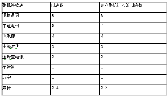 在贵阳手机卖场总共有30 多家,其中手机连锁店占手机市场容量的 70 %,分别是:迅捷通讯、中意电讯、飞毛腿、中邮时代、金蜂星电讯、星运通。国美、苏宁连锁家电总共有 2 家,占手机市场容量的 6 %,中国移动、中国联通、中国电信等手机运营商总共 3 家,占手机市场容量的 10 %,水货、二手市场共 4 家、占手机市场的14%由于进场费问题,金立手机没有进入国美家电连锁;由于金立品牌暂时没有进入手机运营商全国统一的采购名单,他们在贵阳丧失了与当地运营商的谈判权。金立手机只能在6 家手机连锁店的圈子里辗转腾挪,与国内外十几个品牌挣食吃。(见表一)