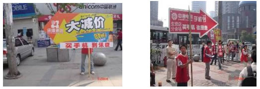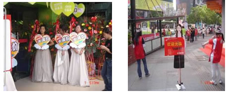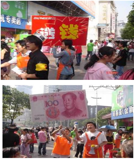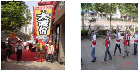 卖场外流动喊话是几个人一组,一人领队喊口号,其他人跟着喊,目的是造势宣传。流动喊话是一个卖场一个卖场轮流宣传,从店外到冲进,从店内冲出店内,而且,喊话者必须统一着装,身披金立促销服装,体现金立形象。(见下图)