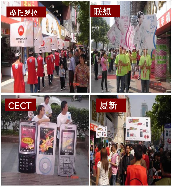 品牌厂家不约而同地搬出十八般“兵器”阴翳弊日,如皇帝驾崩送葬一样热闹。摩托罗拉打出知名商标,联想推出色彩卖点,创维、厦新、中电或打出降价手机图片或摆放降价手机模型。(见下图)