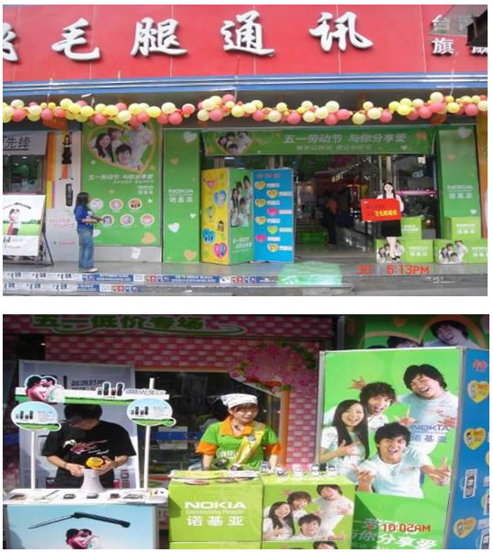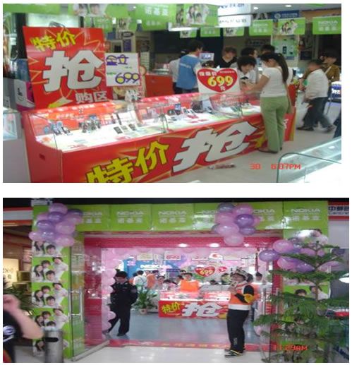 走在户外,手机打打杀杀造势宣传的热浪此起彼伏比及家电连锁开业的热闹场面,有过之而无不及;踏入店内,厂家正见缝插针忙于终端美化。本来已经占据各连锁卖场有利地形的诺基亚又通过对手机连锁施加压力或拉拢或“买位“的方式,“独家垄断”了各个手机卖场吊旗、地贴、店面装饰。并且先下手为强布下的天罗地网般的POP,完全掐死了众厂家在终端美化方面与之争风吃醋的资格。(见下图)