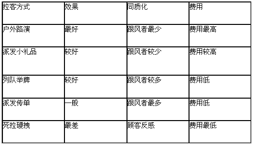 促销的过程可以描述为两句话,一是千方百计把东游西逛的顾客拉到柜台前,二是想方设法让他购买。概括为四个字就是“拉客-杀客”。如何拉客?哪种拉客方式效果好费用低?这里推荐一个《拉客比对表》,比较如下。